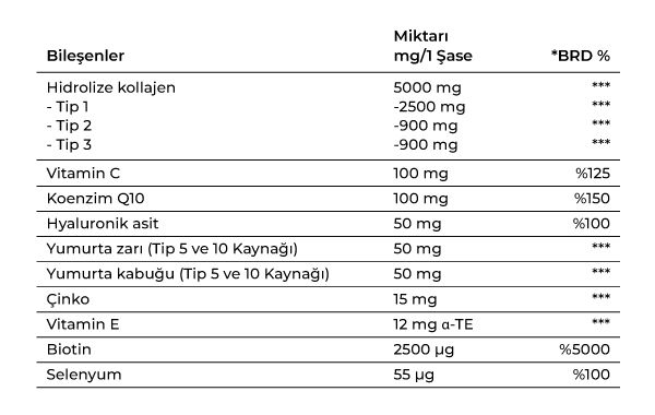 Excipient (for bulking purposes): Maltodextrin, L-Ascorbic Acid, Coenzyme Q10, Hyaluronic Acid, Egg Membrane (Source of Types 5 and 10), Eggshell (Source of Types 5 and 10), Zinc Sulfate